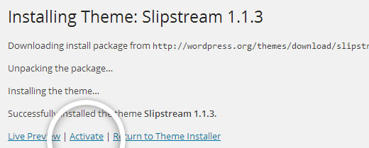 Cuando esté instalado el tema, tendrás un mensaje de éxito con junto con un enlace de activación y otra opción que te permite ejecutar una vista previa del tema.