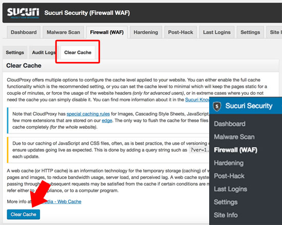Esta caché la podrás borrar directamente del plugin Sucuri dirigiéndote a la opción Sucuri y seleccionando Firewall WAF directamente en el área administrador de WordPress.