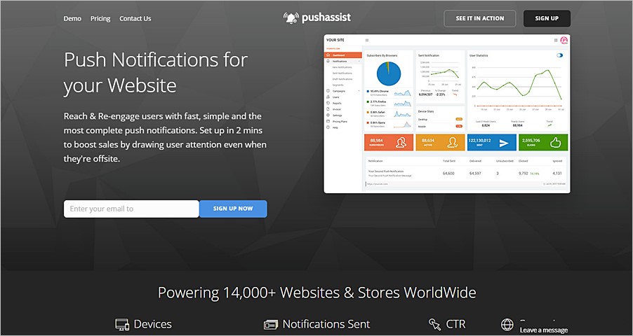 PushAssist es una herramienta de notificaciones push admitida por los navegadores Chrome, Firefox y Safari. Es fácil de configurar y funciona tanto en equipos de escritorio como en dispositivos móviles.