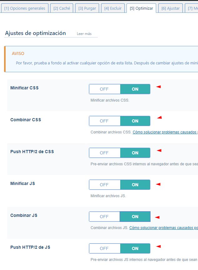 Es importante resaltar que la optimización de este plugin siempre va a variar dependiendo del tema que tengan ejecución y los plugins que utilice. Por esto, no existe una configuración estándar. Deberá realizar varias pruebas hasta que consiga habilitar la mayor cantidad de optimizaciones que pueda sin modificar el rendimiento y visualización de su página web.