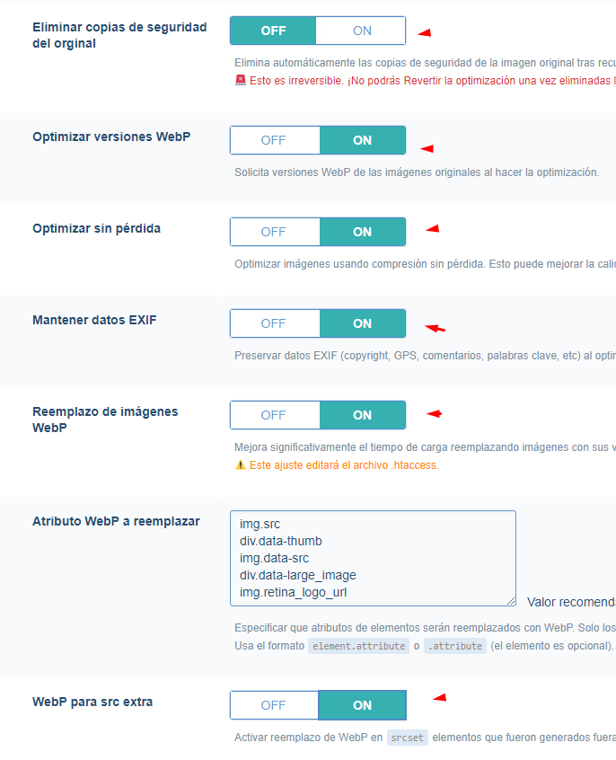 Reemplazo de imágenes WEBP: esta función regenerará todas las imágenes que usted tenga en su WordPress y las convertirá en un formato .webp que reduce su tamaño en un 30% sin perder su calidad.